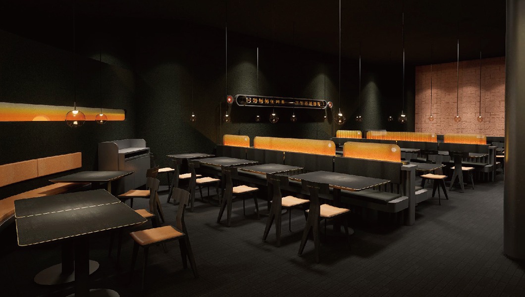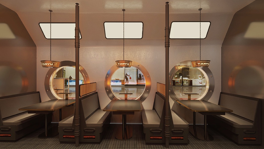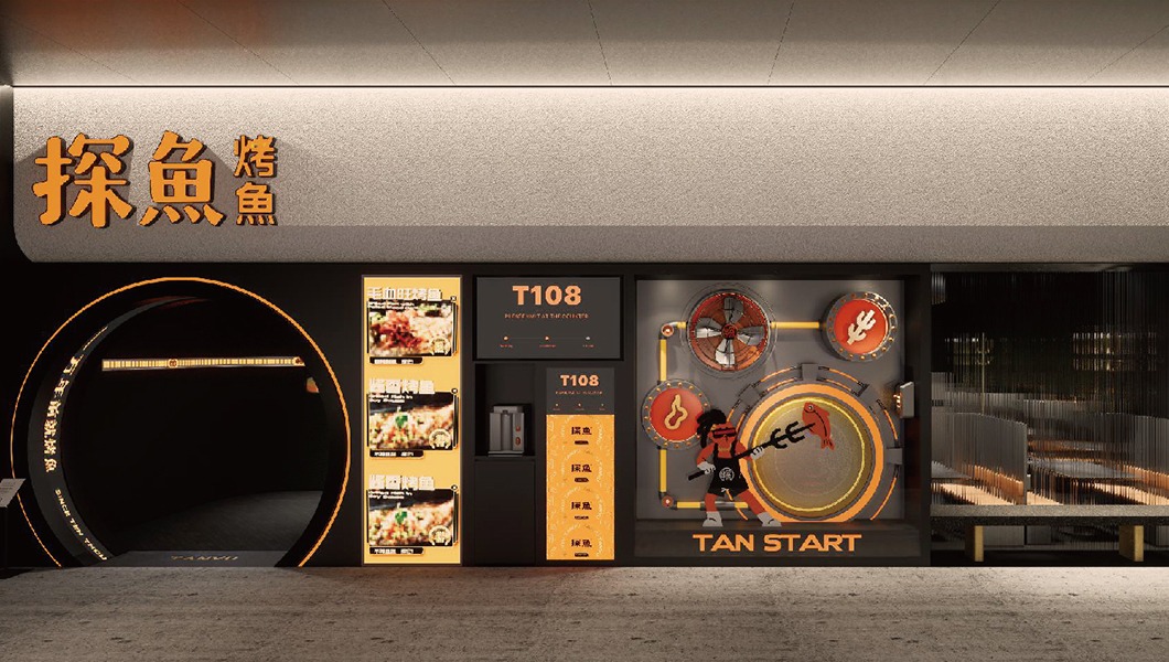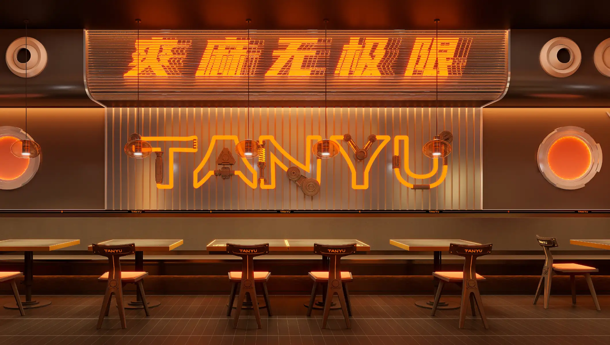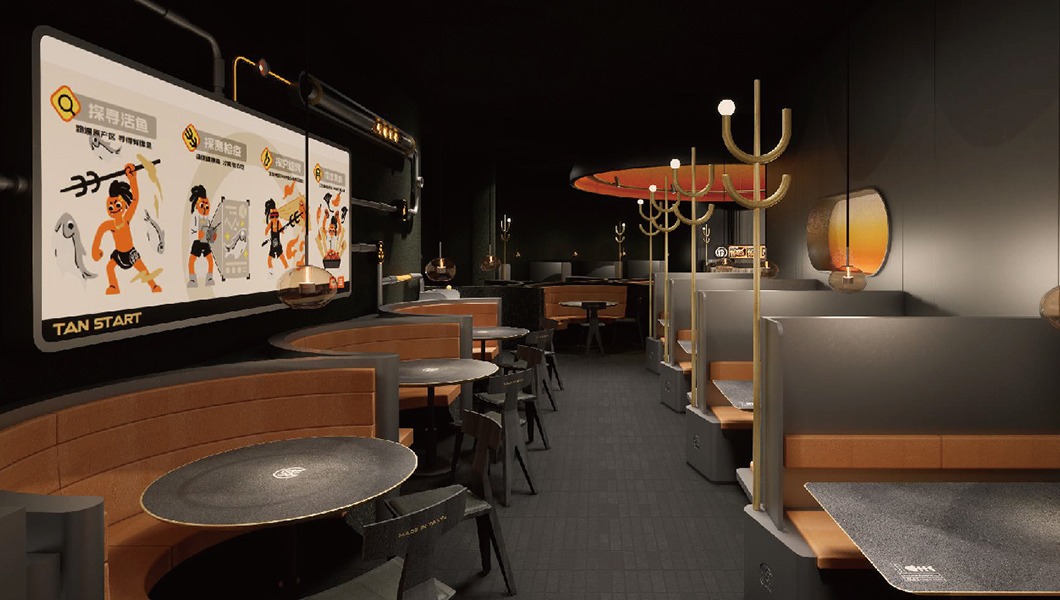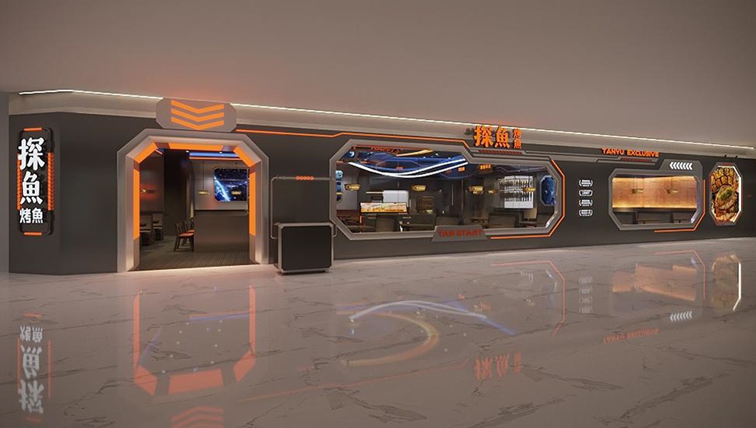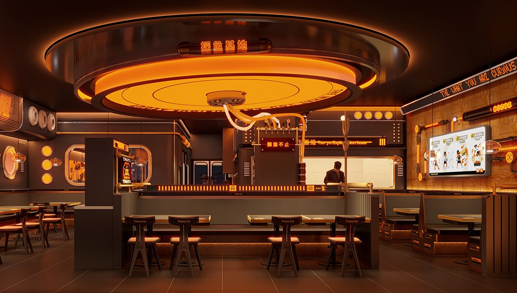 藉由”基地“灵感,整个空间融合赛博朋克设计与未来基地的科技感,五感联动一步一景,塑造可感知、有记忆的用餐场景,进行全方位的文化故事以及趣味性浸润,打造为未来探鱼基地,以此强化品牌独一无二的调性与价值。