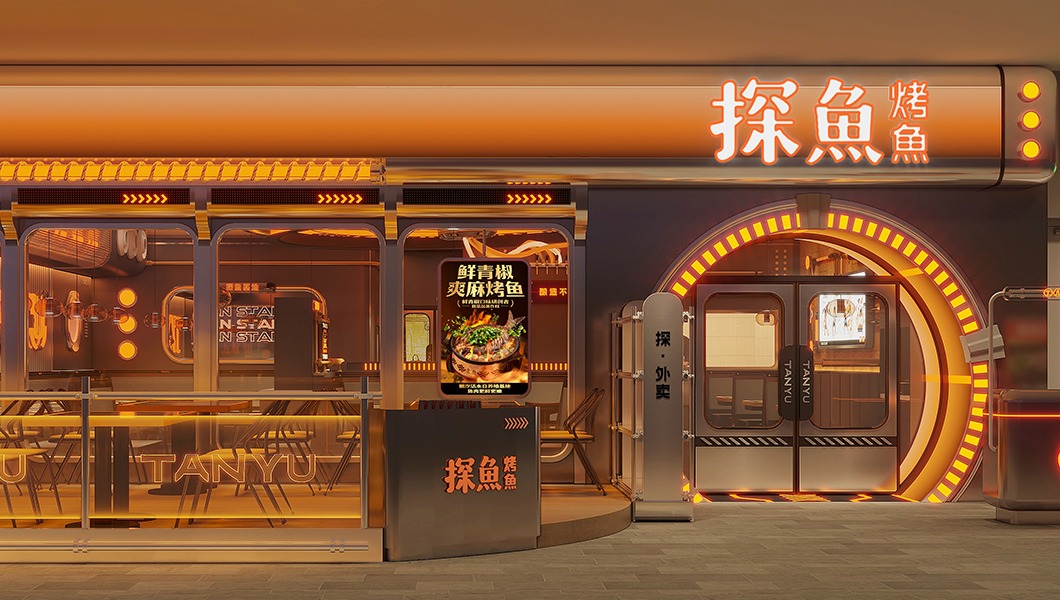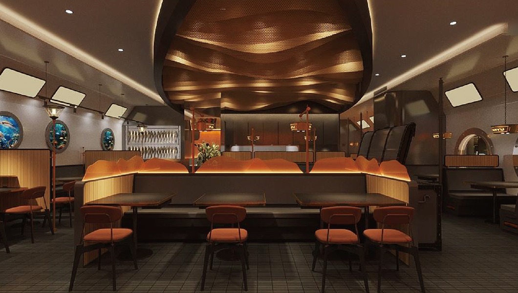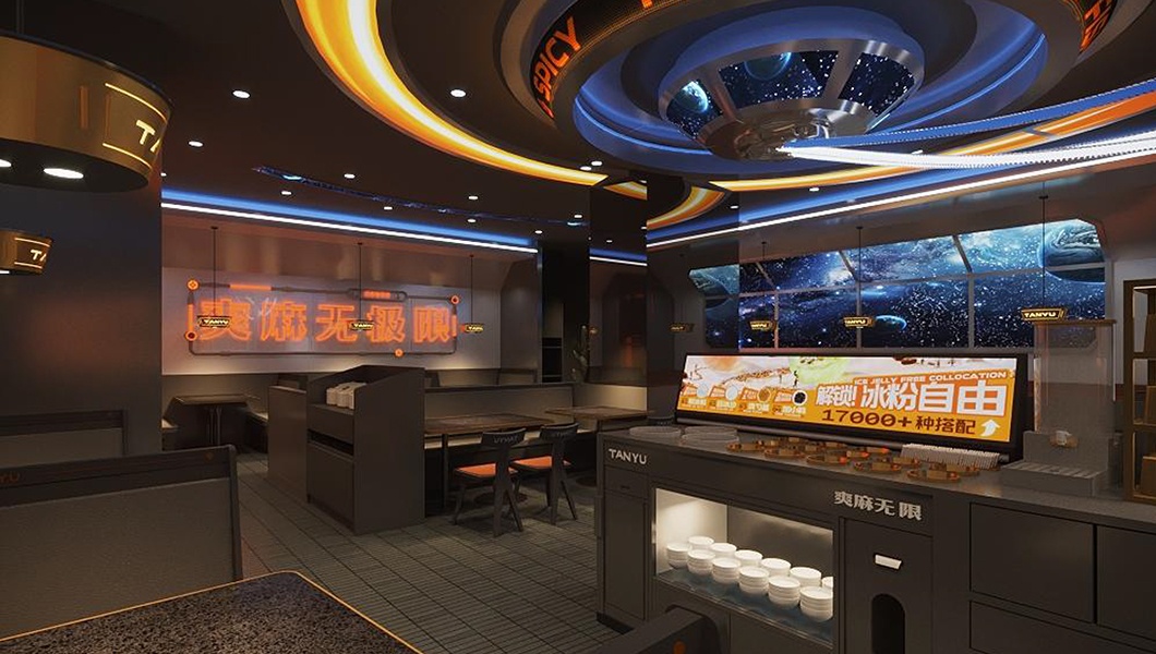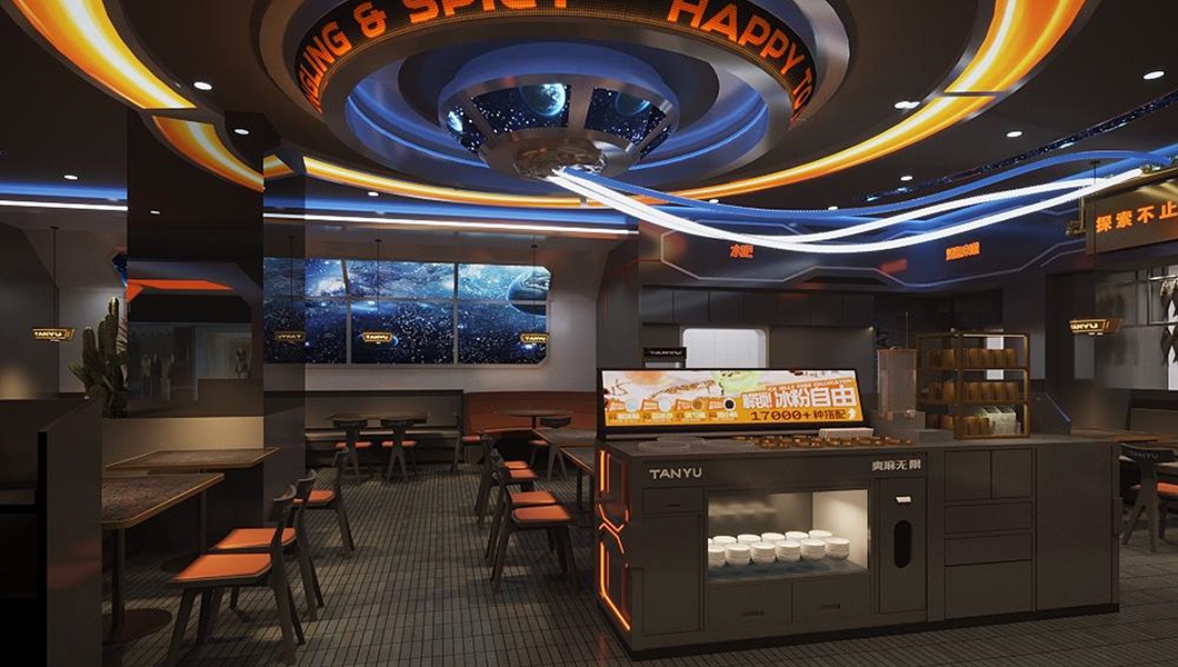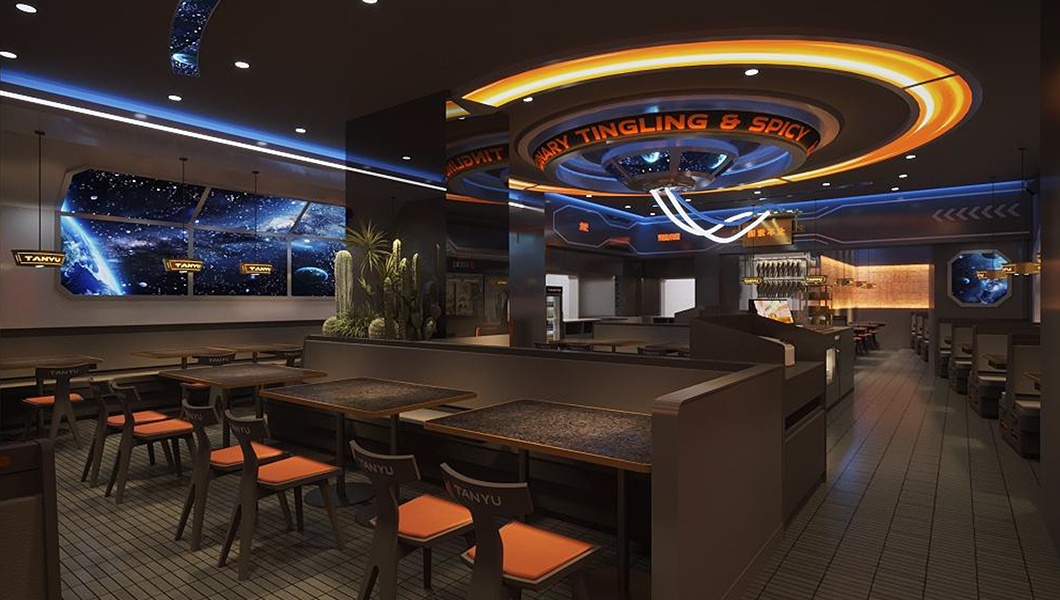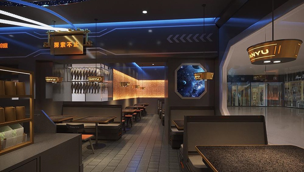 在打破传统餐饮空间的局限,将“探鱼”品牌探索、美味的基因,升华为一场穿越时空的星际漫游与味觉探索。整个空间便是这颗星球的缩影,顾客在此化身为星际旅人,在星辰大海中探寻美味的终极奥秘,体验一场视觉、听觉与味觉交织的多维盛宴。