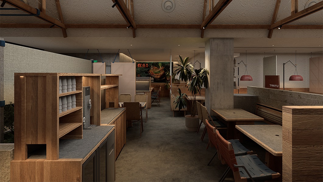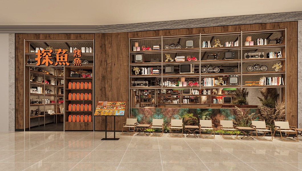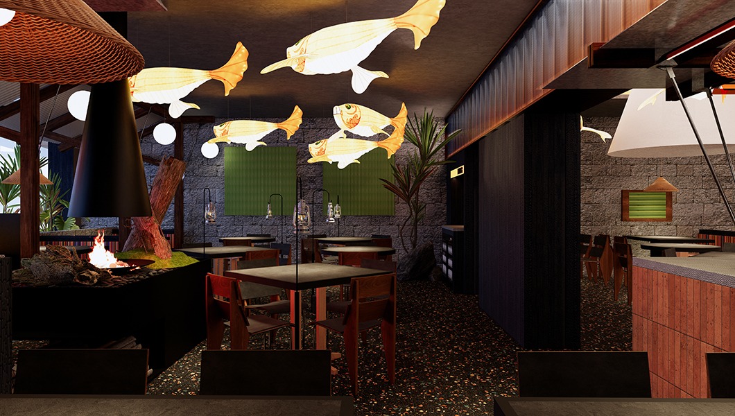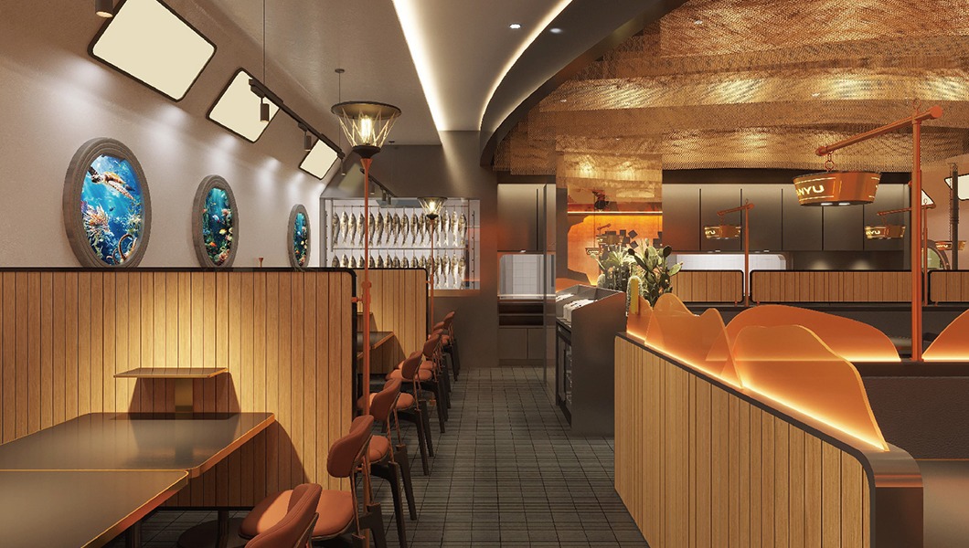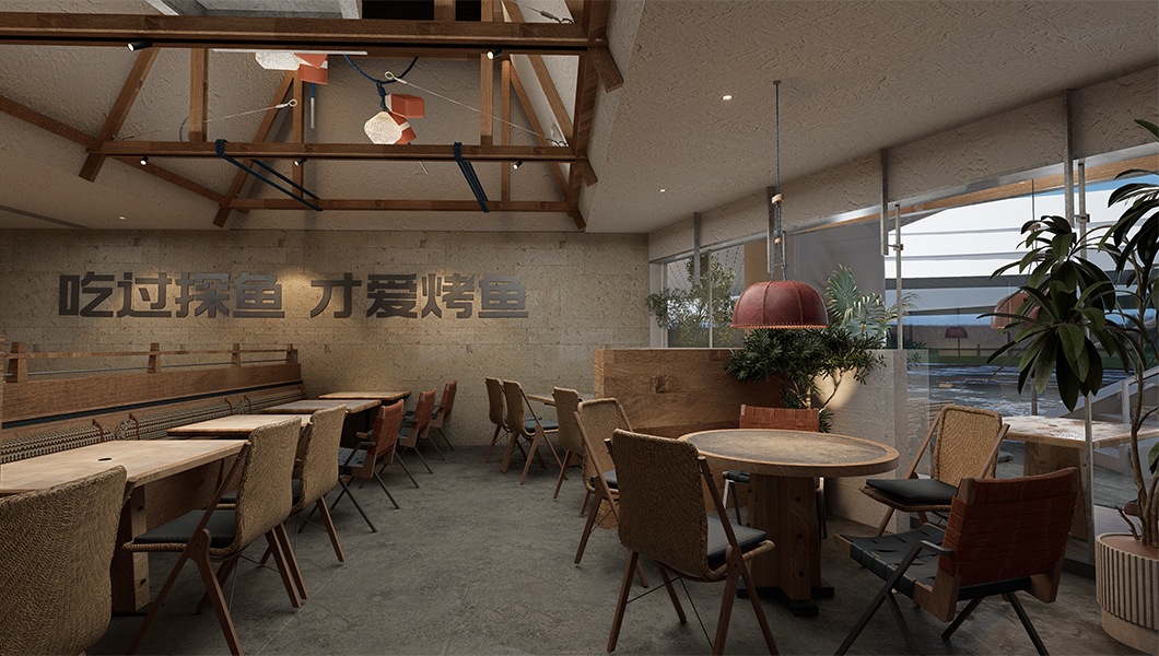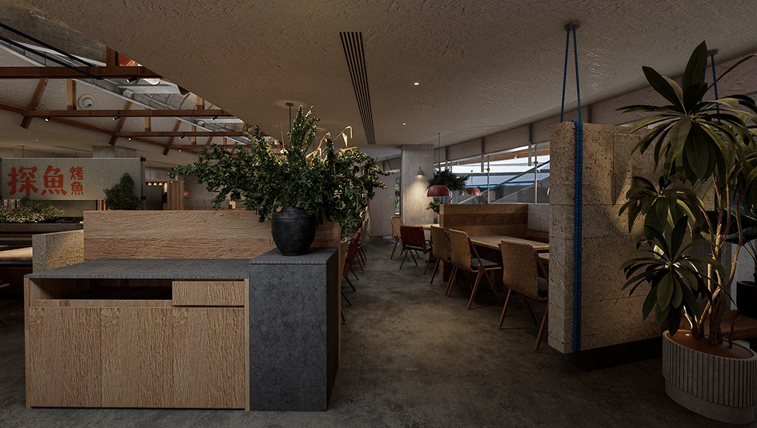 由入口向外延伸出的竹棚作为引入,将商场消费行为支配下的繁忙隔绝于外,取而代之的是一座安静的边陲渔村,由此形成了沙滩上摇曳的煤油灯、屋檐边卷起的浪花、聚落的渔排不仅营造出一种烟火气,仿佛每一次烤制的诞生都带有海风的气息,用心体会烤鱼的本味。