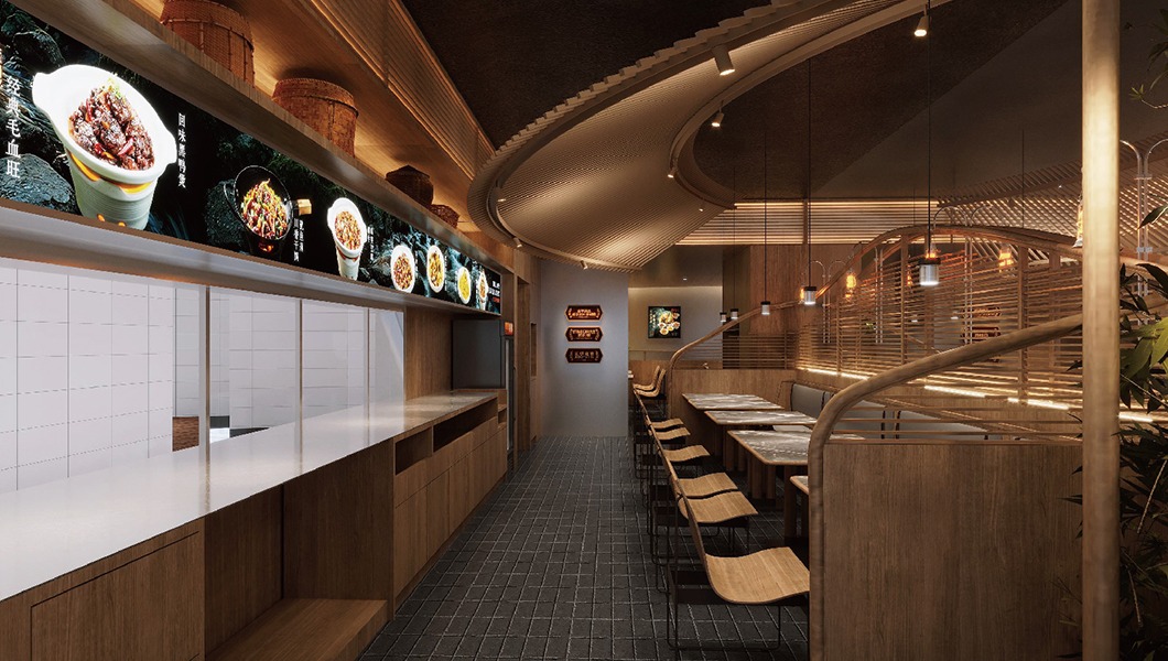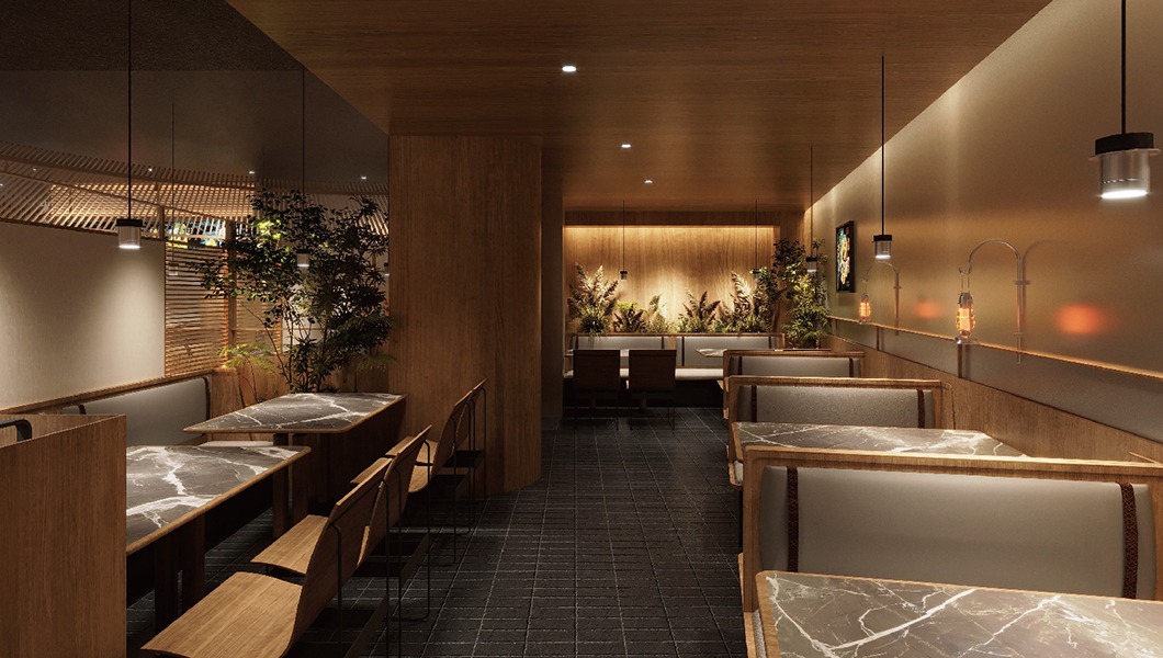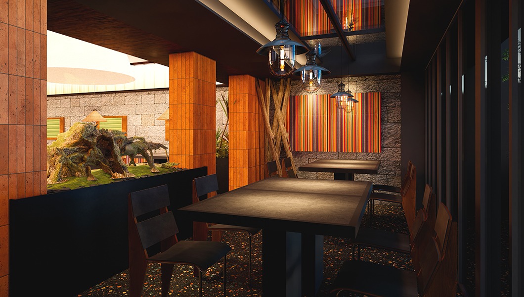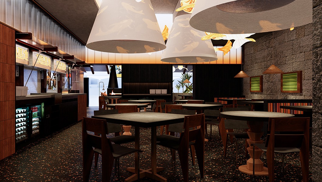 以现代东方美学为核心,结合自然元素与温暖的材质,营造出独特的用餐氛围。整体空间以深色木材、石材墙面和暖色调灯光为基底,营造沉稳而富有质感的环境。吊灯设计别具巧思,鱼形灯饰与大型装饰灯罩传递出灵动与趣味,使空间氛围在雅致中点缀生动。
