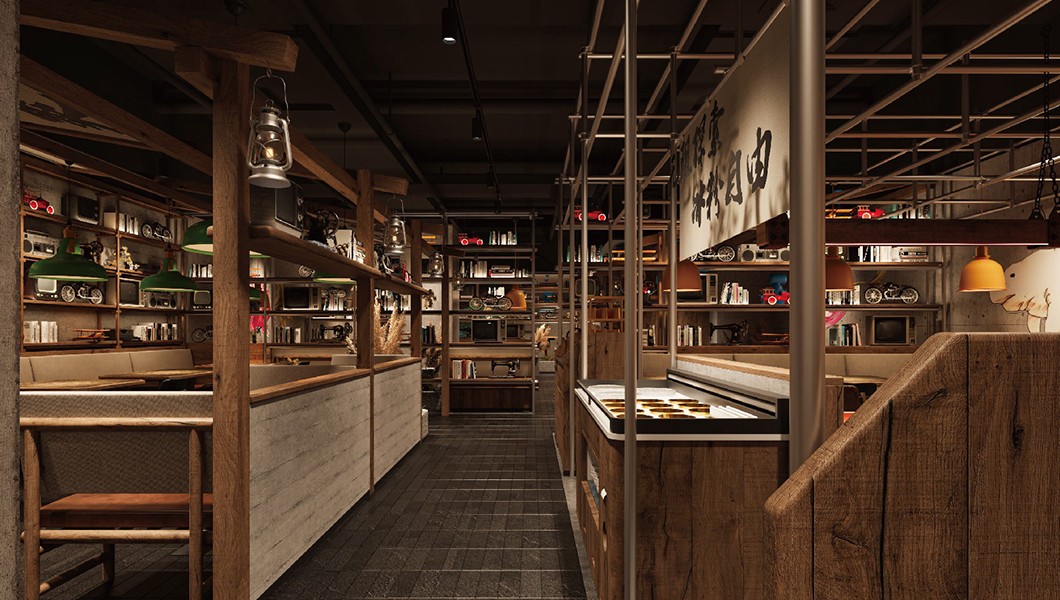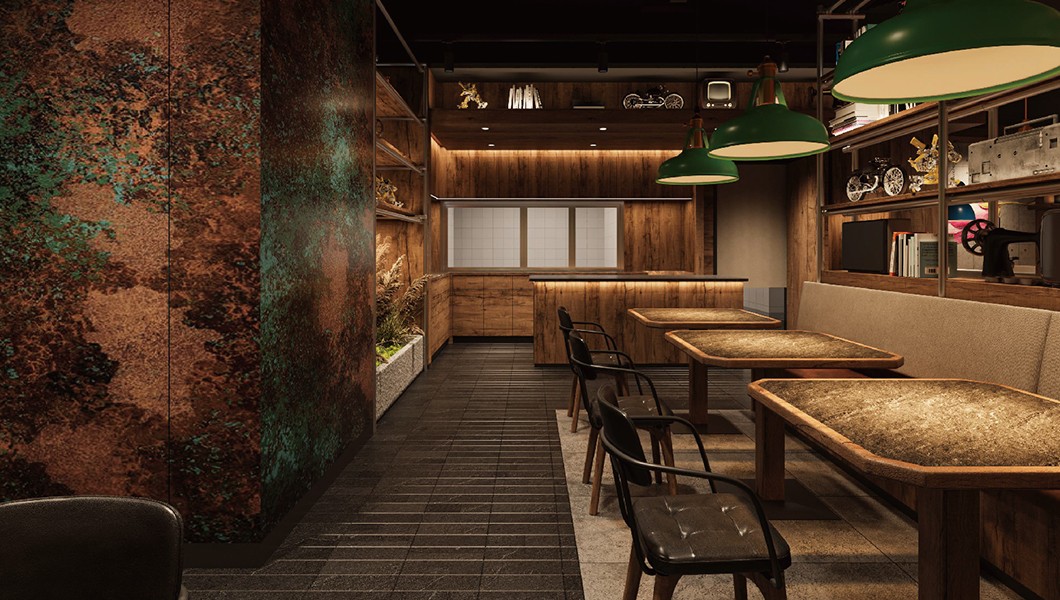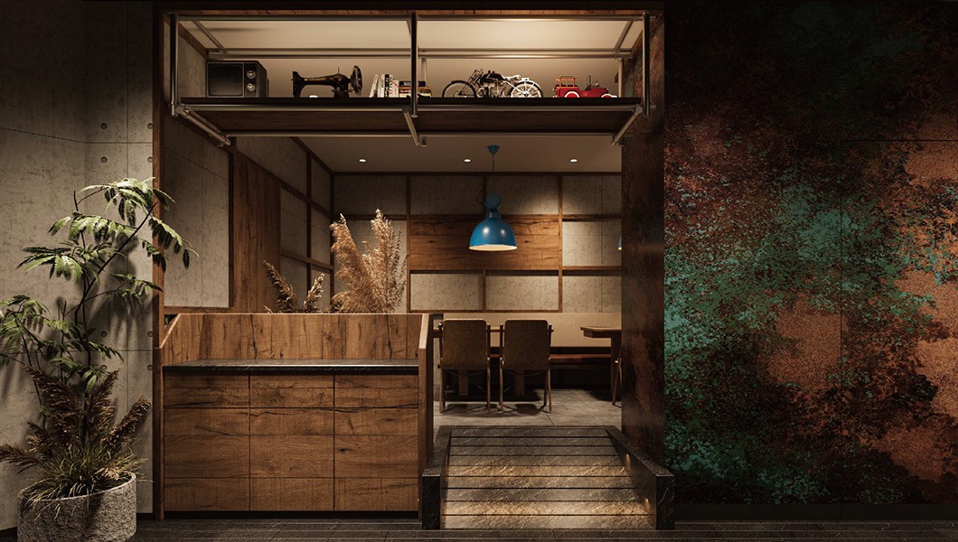 整体以深木色与金属框架为主调,墙面与隔断采用温润的木质肌理与水泥灰色质感,传递出一种质朴而不失厚重的空间气息。